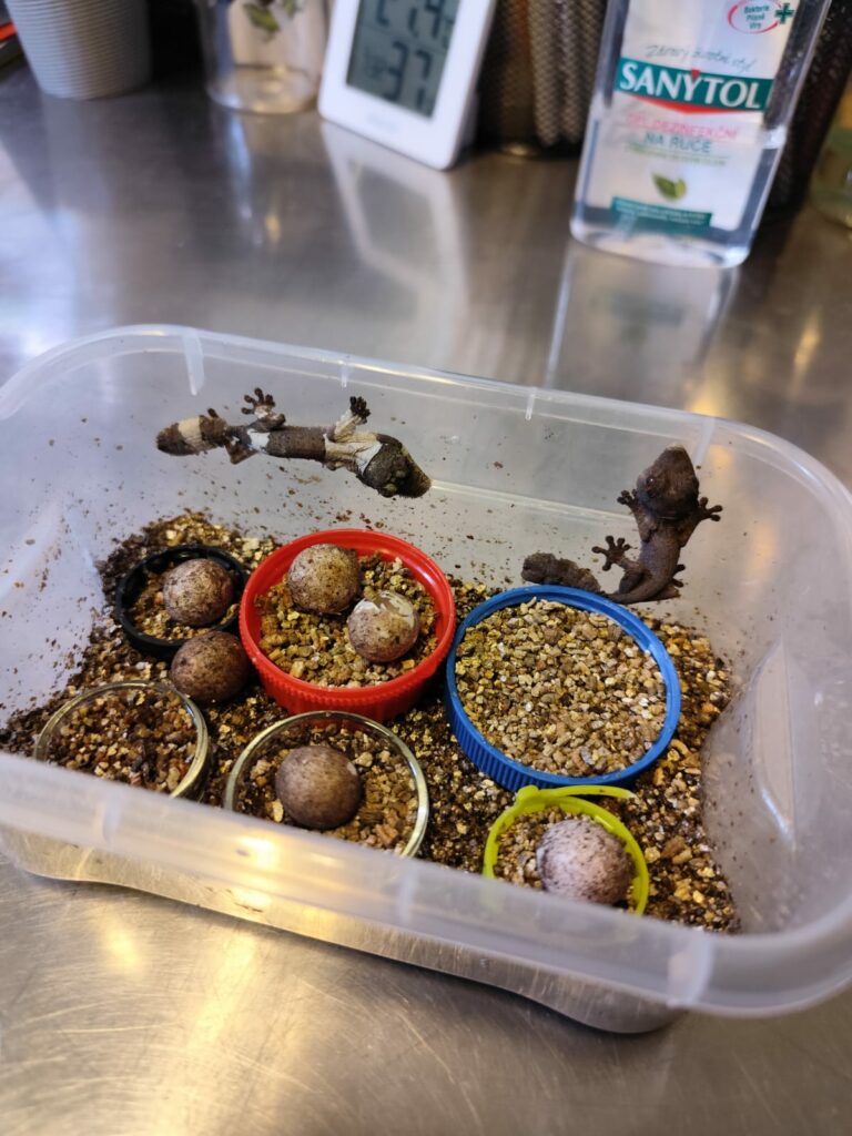 V expozičním teráriu jsou umělé imitace stromů a skal, liány a tropické rostliny. Substrát je přírodní, tvořený listy, piniovou kůrou a trochou rašeliny. Součástí terária jsou i čtyři větrací komínky a stejný počet závlahových trysek. Na stropě je dále nainstalováno několik typů osvětlení – kompaktní žárovka LED UVB 10.0, 2x LED lišta (1x spektrum modro-červená pro zvýraznění barev) a 70 W výbojka UVB (ta je však vypnutá). V teráriu držíme přes den teplotu 24–27 ̊ C, s nočním poklesem na 21 ̊ C a vlhkost obvykle 70-80 %. Samice klade vajíčka v nočních nebo brzkých ranních hodinách do substrátu. Vajíčka opatrně přesouváme do plastového boxu s vermikulitem a necháváme je v teráriu rodičů až do vylíhnutí mláďat. Uvnitř boxu se drží vlhkost kolem 80-90 %. Samice nám letos nakladla 12 snůšek, poslední tři snůšky vajíček jsou stále v plastovém boxu na vermikulitu. Oba dospělí gekoni jsou od listopadu do konce ledna přesunuti na tzv. zimoviště, kde jsme schopní držet nižší teploty. Samice i zde zatím nakladla jednu snůšku vajíček. Snůšku tvoří většinou dvě vajíčka, ze kterých se nám líhnou mláďata obvykle po 82-98 dnech a průměrně váží 1,6 g. Více informaci je v tabulce níže. K dnešnímu dni (20.12) se nám vylíhlo 15 životaschopných mláďat. V letošním roce se tak jedná o nejpočetnější odchov mláďat od jedné samice v rámci koordinovaného chovu EAZA.