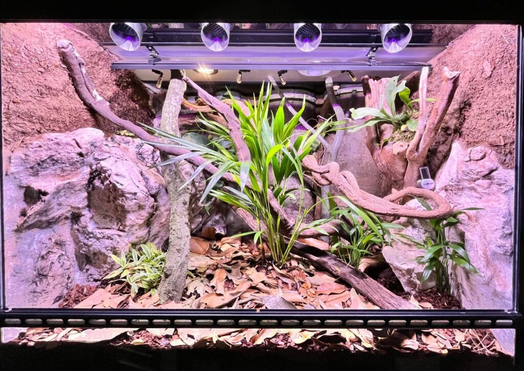 V chovatelské místnosti stojí dva pojízdné regály na kolečkách. Vyrobené na míru tak, aby je bylo možné přisunout přímo k prosklené stěně oddělující návštěvnickou část od zázemí pavilonu. Ve stojanech je usazeno 14 skleněných terárií a veškeré jejich technické vybavení nezbytné pro vytvoření kvalitních podmínek chovu. V horní části každého terária jsou nainstalovány rosící trysky, ventilátory, dále LED osvětlení, které je v některých teráriích navíc kombinované s UVB výbojkami. Osvětlení a závlaha z každého terária jsou napojené na časové spínače. Rosící trysky napojené na drobné trubičky vedou do velké nádoby s vodou. Tato voda je upravena reverzní osmózou. Díky tomu nedochází k zanášení trysek a skel vodním kamenem. Součástí technického vybavení jsou i odpadní trubky, které odvádí přebytečnou vodu z terárií do sběrných nádob ve spodní části stojanů. Vnitřní vybavení terárií je přírodního charakteru od 3D stěn až po využití tropických rostlin (např. bromélie, tilandsie, orchideje), mechů, umělých lián nebo korkových větví a imitací skály. Z umělých skal jsou také vytvořeny prohlubně zachycující vodu.